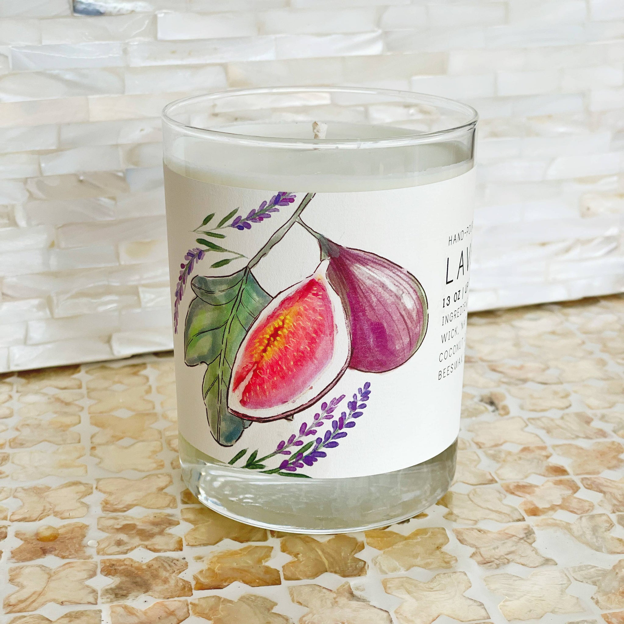 Notes of Lavender, Fresh Fig, Cedar and Fern Imagine a serene escape into a lush, sun-kissed garden where the soothing aroma of lavender gently intertwines with the unique, sweet freshness of figs. Our Lavender Fig candle is a masterpiece crafted for tranquility, blending the calming essence of lavender with the distinct, succulent notes of fresh fig. The heart of this scent lies in its earthy undertones, where the rich warmth of cedarwood meets the crisp, green embrace of fern, evoking a sense of peaceful, rustic elegance. This candle is perfect for creating a tranquil ambiance in your home or as a thoughtful gift for someone special. With its alluring aroma and beautifully crafted design, the Lavender Fig candle transforms any space into a haven of relaxation. INGREDIENTS: 100% NATURAL COTTON WICK, NATURAL SOY WAX, ORGANIC COCONUT OIL, NATURALLY GATHERED BEESWAX, FRAGRANCE, ESSENTIAL OILS 13 OZ | UP TO 70 HRS 7 OZ | UP TO 40 HRS 3.5 OZ | UP TO 20 HRS